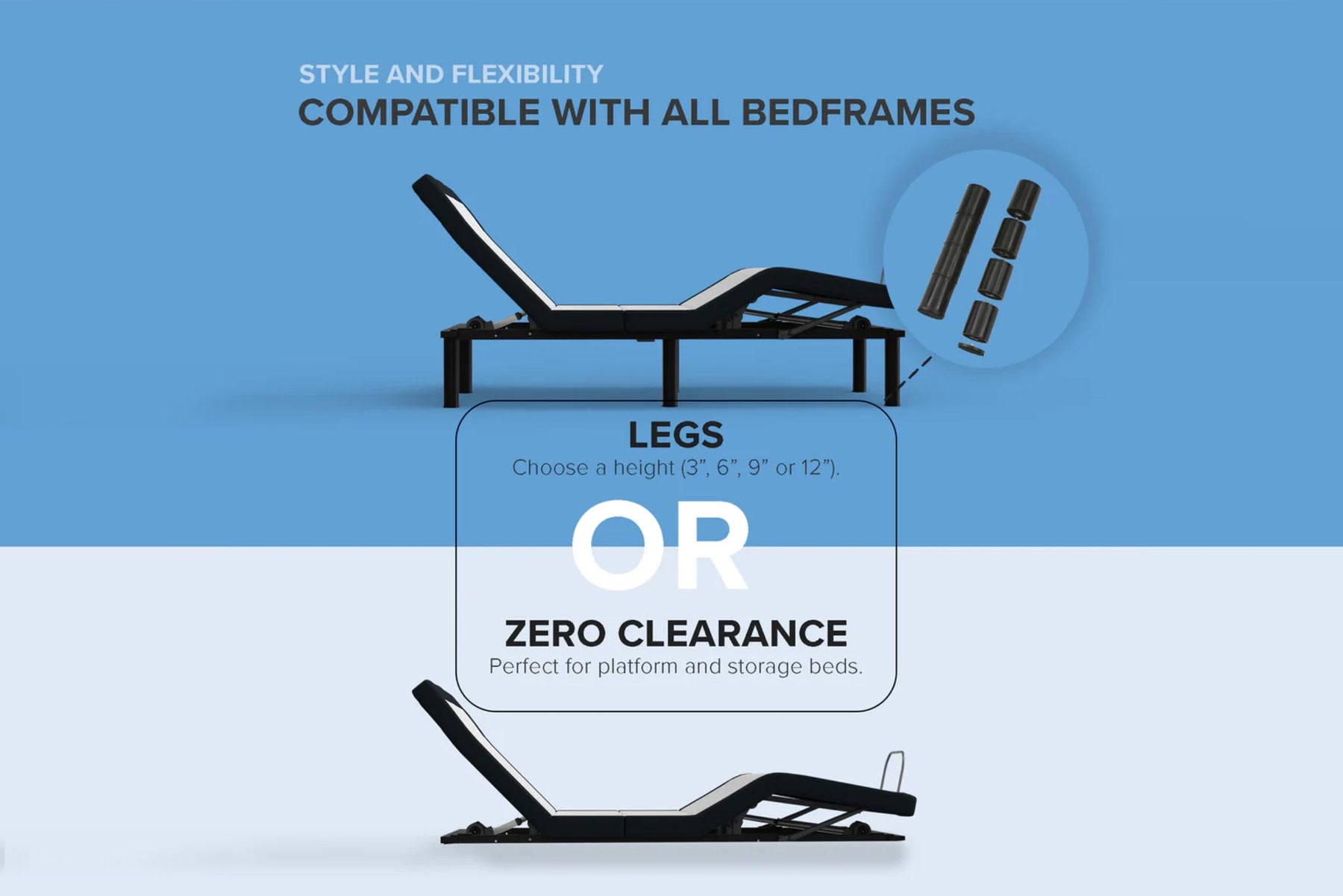 14 button wireless remote allows for 3 programmable memory positions, massage features and timer, anti-snore, zero-gravity, one-touch flat, zero-clearance capability (fits into most bedframes), foot retainer bar, USB charging ports, underbed LED lighting, 3" to 12" adjustable legs and backup battery strip.